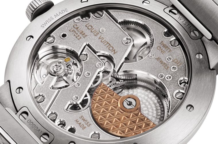 路易威登La Fabrique du Temps制表工坊和独立制表品牌SPEAKE-MARIN Le Cercle des Horlogers工坊共同开发新一代Tambour搭载的LFT023自动机芯,单是LV自家的工坊就足以做出一枚够水准的机芯了,何况还集结另一间高水准品牌的技术实力。在透明底盖下方露出的LFT023机芯让人留下深刻第一眼印象,因为很少看到机芯基板全面以粒纹装饰,而且底板出现满多折角,类似的设计通常比较常在PP或VC等顶级品牌的作品中出现,有折角表示单纯靠机械加工没办法修饰得很精细,需要倚赖手工逐一进行倒角拋光等工序。除了底板的修饰之外,厚度很有份量的K金微型自动盘表面也用手工刻出了连绵不断、象徵LV的V形刻纹,单就这部分可以看出是很耗时费工的项目,因此要完成整枚机芯的难度自然不小。这枚机芯没有意外地通过瑞士天文台认证,身为高级手表,拿到这项认证说明了品牌的基本功,这也符合大家对这种价位手表的期望。