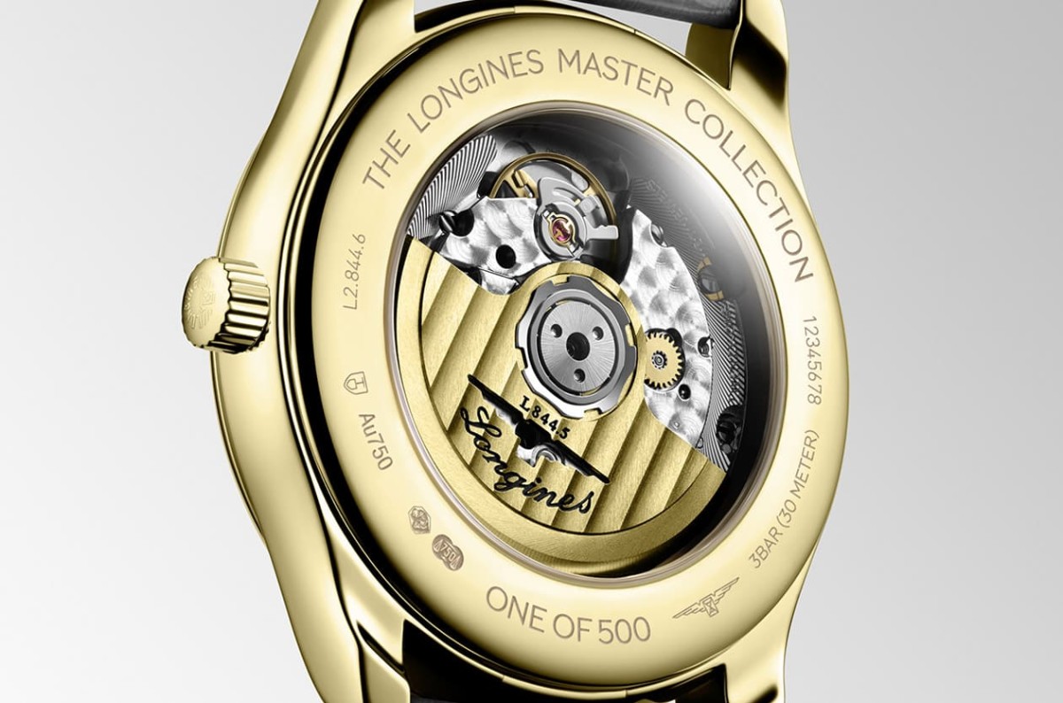 手表表背以透明底盖展示内部的L844.5自动机芯,首先映入眼帘的是与表壳同色调的自动盘,浪琴表採用日内瓦波纹点缀自动盘,盘面上可见镂空设计呈现出飞翼沙漏的轮廓,而在机芯底板上则有鱼鳞纹、中层夹板也还有环形放射打磨烘托品牌扎实的工艺水准。机芯本身融入硅游丝与品牌选用的高抗磁零件,多管齐下使得机芯的抗磁性能达到比ISO 764抗磁标准高十倍的境界,确保手表的走时品质更能不受生活中的磁场影响而维持在高档。此外机芯的动力储存达72小时也很实用,内外兼具的品质与手表的贵金属表壳相互辉映,手表相对稀有的特性直接刻在底盖边缘6点方向的限量数字上。目前浪琴表的Master GMT仅限品牌位于台北101的名品店独家销售,对这款表有兴趣的人可别遗漏这项重要资讯。