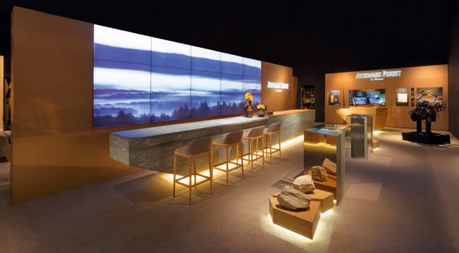 爱彼的展览区展示了品牌今年全新的专门店概念,让顾客尤如置身爱彼瑞士厂房。透过引人入胜的故事、具説服力的敍述,展示爱彼独有的力量和个性,让顾客了解品牌的起源。以建立顾客与品牌之间独特的关系,正是顾客品牌体验的重点。贵宾区、制表师工作区以及手表橱窗都能让人体验品牌的魅力,木质为主的室内设计和柔和的灯光则让人联想到爱彼的发源地汝拉山谷。