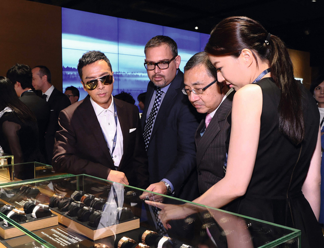 9 月 26 日,国际巨星甄子丹先生及旭日国际控股有限公司创始人蔡志明先生亲临爱彼展览区参观了现有的手表系列,对制表师的工作臺及制作表盘格纹的雕刻机深感兴趣。