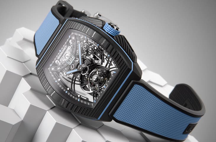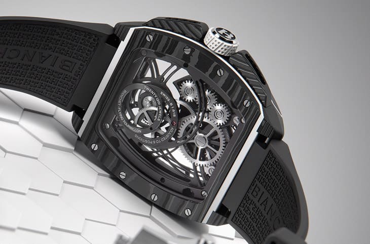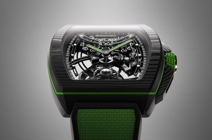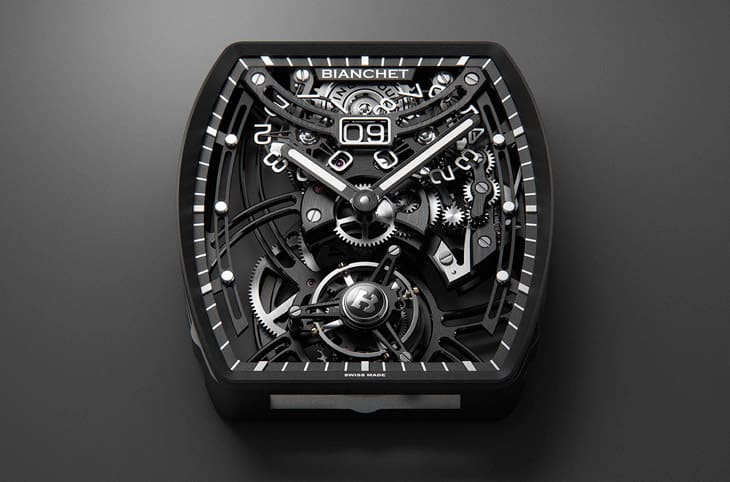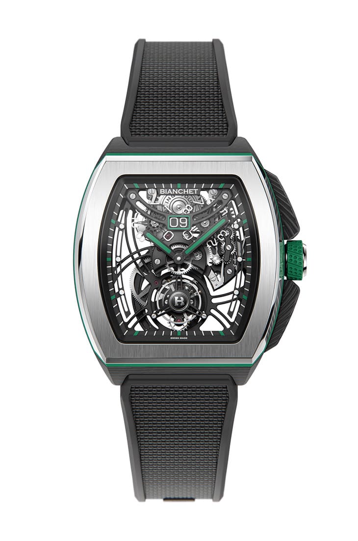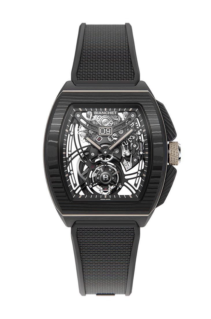 ▲BIANCHET为新兴独立制表品牌,手表特色在于採用酒桶形表壳结合碳纤维材质,加上镂空陀飞轮机芯,内外设计都令人惊艳。