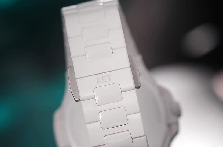 AET REMOULD此次再度以白色陶瓷重新制作手表的表壳、表圈和链带等零件,一如之前改装表品牌创作的作品,他们的陶瓷表壳是使用自家研发的第二代HTP工艺生成,大致而言其于制作过程中会经过2,000巴的高压和1,500°C的高温烧结成陶瓷,如此能让陶瓷既坚硬而且质地又更加匀称。