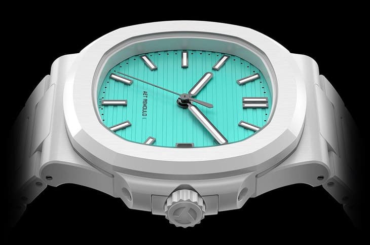 至于"Lefkada Blue"也是从莱夫卡扎当地的海洋顏色取经,这次的蓝色调比起前面提到的两款作品都更接近TIFFANY蓝,散发一股清新、寧静又深邃的气息。AET REMOULD将面盘顏色改换成Lefkada Blue之际,原本的水平饰纹被完整保留,由此散发出犹如平时海浪节奏般的规律动感,而Lefkada Blue搭配在白色陶瓷表壳上像是天生一对,纯白色调完整烘托出Lefkada Blue的视觉魅力,使其戴在手上不只面盘亮眼,而是整只表的对比色组合都能吸引视线聚焦,就像我们置身在莱夫卡扎的海滩上,对于眼前自然美景陶醉不已的时刻。改装表品牌这次改装的金鹰5711有几个细节和过去的类似款又再做出区隔,包括表冠也改用和表壳一致的白色陶瓷,另外面盘12点方向的PP原厂Logo也被取消,只留下6点方向的AET REMOULD标志,从中也更能确定这绝非百达翡丽原本的TIFFANY蓝面。