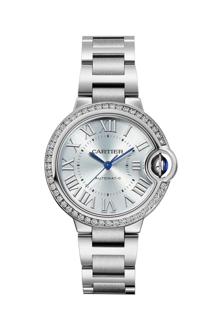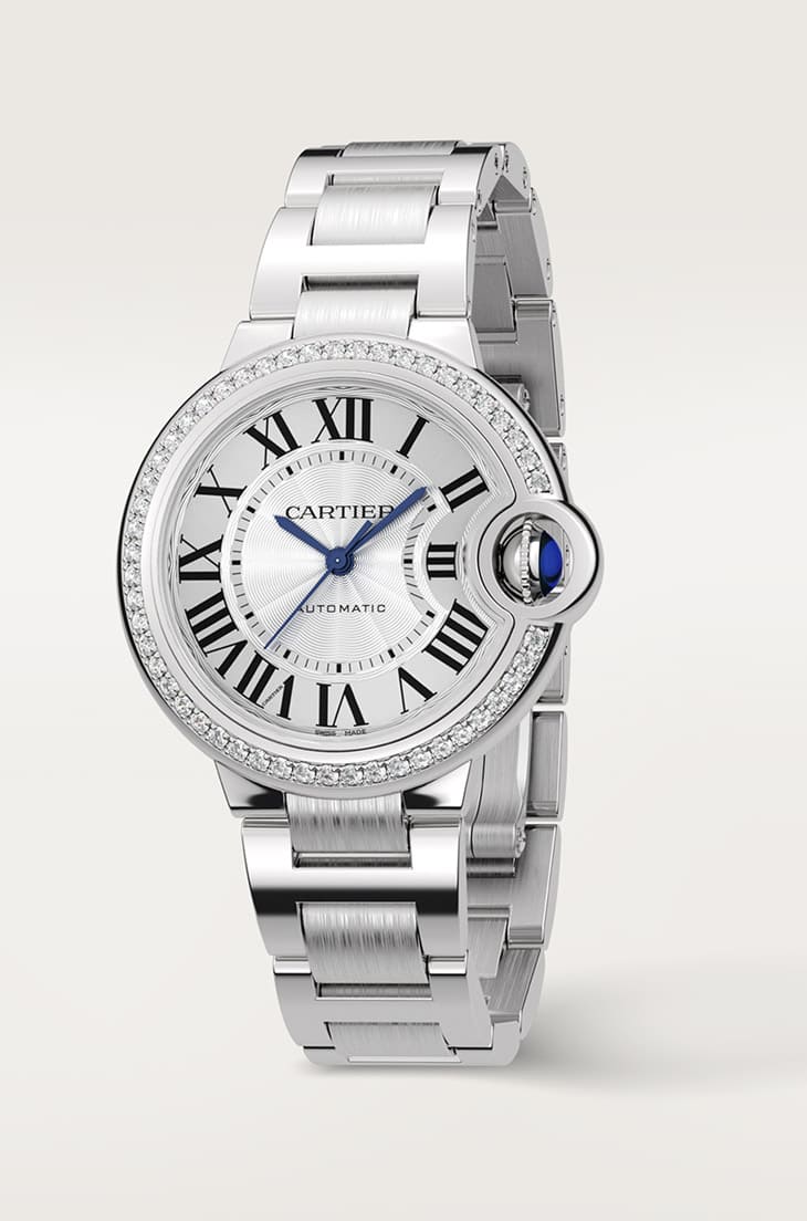 蓝气球系列的定位并没有特别设限,尺寸发展至今从28~42mm不等,无论男性或女性都可以从中挑选出适合自己手腕大小的款式。除了表径之外,Ballon Bleu de Cartier的选择多样性也表现在材质、机芯与表带等细节,这款表的表壳从精钢、半金,到白金、黄金或玫瑰金等一应俱全。蓝气球家族中尺寸最小的28mm为唯一搭载石英机芯的作品,而33mm以上的款式则是搭载自动机芯,入手前可以先注意到不同尺寸会有机芯类型的差别;而在系列演进的过程中也发展出了Ballon Blanc de Cartier此一子系列,其尺寸分为26mm与30mm,与一般的Ballon Bleu de Cartier腕表相较显得较柔美轻盈,品牌将圆中带圆的设计移至4点钟方向,并于其表面镶嵌一颗美钻(表冠则藏身在钻石下方),由造型的细微变化展现系列的设计潜能。除了表壳尺寸之外,蓝气球系列的表带也富有变化性,既有比较偏正装感的皮表带,也有运动风较浓的链带款式,这点和表壳尺寸的选择性刚好相辅相成,爱表人士总是可以在卡地亚所提供丰富的产品阵容中,找到梦寐以求的理想目标。