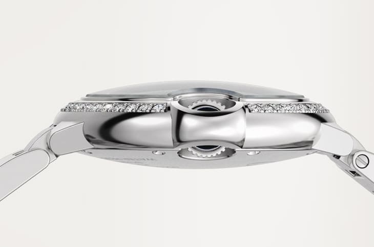 ▲除了圆形表壳线条,Ballon Bleu de Cartier系列的上下镜面与底盖也呈现出圆弧状,另外表冠更呈现「圆中带圆」的招牌特色设计。