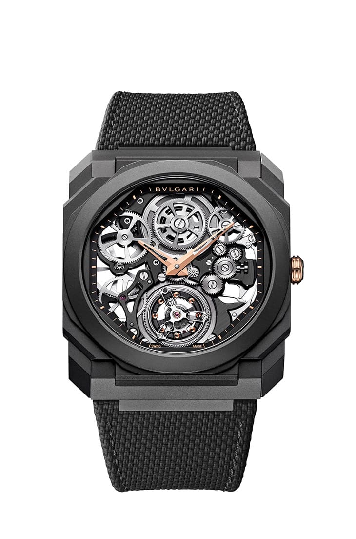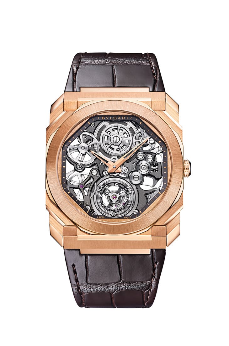 宝格丽2024年也同样回顾了过往创下的超薄纪录,针对他们一鸣惊人的成名作——Octo Finissimo Tourbillon,推出手动上链与自动上链款式的改款新作,它们虽然搭载的机芯有手上链和自动上链之分,不过机芯厚度都只有1.95mm,其中手上链款式的整体厚度为4.85mm、自动上链款式的整体厚度也只有4.95mm,放眼多数陀飞轮都显得纤薄至极。在手上链的部分,宝格丽分别发表玫瑰金与黑色DLC钛金属两款,前者搭配棕色鱷鱼皮表带,镂空的机芯零件经过灰色喷砂处理,衬托出镀玫瑰金指针的显时作用;后者配置黑色橡胶表带,镂空机芯零件经黑色缎面拋光修饰,而手表的指针与表冠也都是玫瑰金色,在黑色系的背景下显得格外突出。两款表一律搭载BVL268SK手上链机芯,这枚机芯的震频为3Hz,动力储存有52小时,在透明底盖下可以一窥机芯的密致构造。