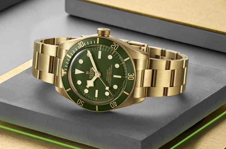 帝舵在2021年推出表壳採用黄金材质、表背有透明底盖设计的Black Bay 58轰动一时,因为手表的材质与表背设计和帝舵多数手表的创作风格有着明显的出入,加上手表又是搭配前几年很夯的绿色表圈与面盘,一登场就躋身品牌最高贵的潜水表作品。2024年品牌再度推出黄金材质的Black Bay 58,它的表圈与面盘顏色一样是绿色,不过有别于前作启用的皮表带(另附上织物表带),新作这次连表带都是用黄金制成,高贵感就地升级,价格方面也呈现二级跳的情况,又一次改写我们对帝舵潜水表价格的认知。