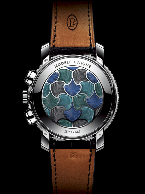 双方合作的结晶就是一幅散发着超凡耀眼光芒的棕櫚树叶作品,如同壁画般惊艳。在经过鐫刻、布满纹理的表底盖上,只要有角度有浮雕的地方,就会有光芒反射出来,令珐琅几乎无时无处不熠熠闪光。色彩虽浓厚但仍不失剔透感:珐琅包裹下,雕刻的每一处绝妙细节都清楚可见,给人以立体景深感。这样的工艺组合让这种罕见的蓝色调丝丝入扣,使得整件作品实现了完美的平衡。