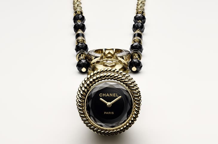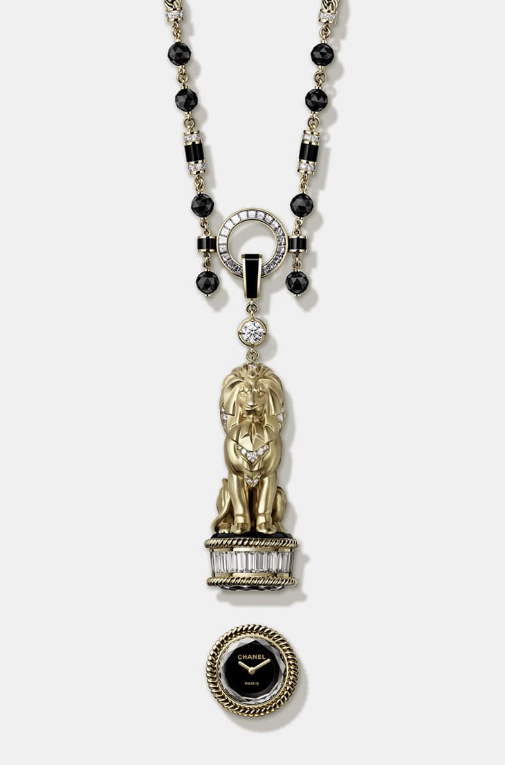 除了精致的狮子雕像,香奈儿在制作时计的长项链时也费尽心力,链条呈现出由复合材质组成的扭索纹状,包括明亮式切割钻石、手工刻面縞玛瑙珠串以及管珠共同构筑出链条的形貌,其于链坠上方的黄金环圈交会,这个组件实际上包含了黄金环圈、縞玛瑙环圈,以及一颗明亮式切割主石,细致的链条造型与链坠搭配相得益彰。