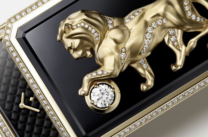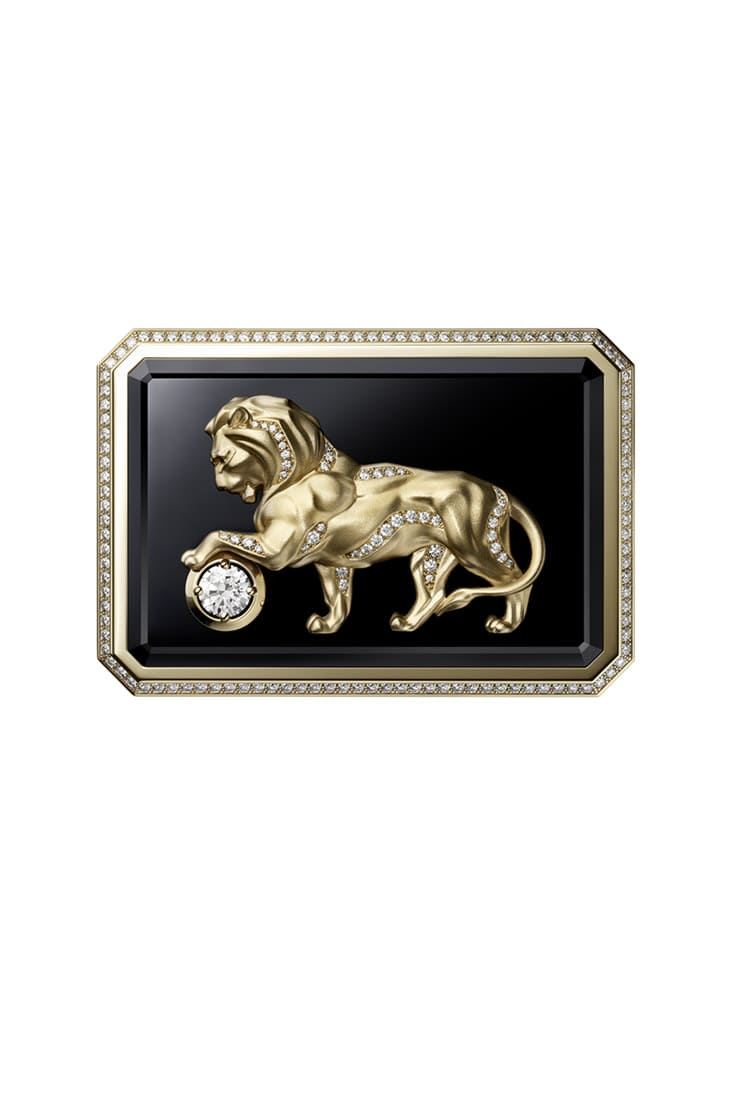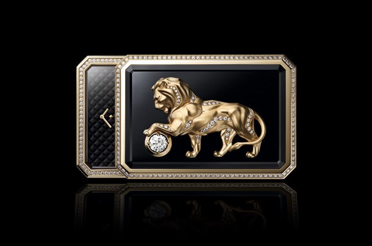 香奈儿于Secret Lion手鐲腕表顶部的縞玛瑙饰板上镶嵌一尊立体黄金狮子雕像,图案的造型受到康朋街31号寓所裡的狮子雕像启发,因此可见狮子的左前脚踩踏着一颗圆球,其中精心镶上1克拉的主钻,与狮子雕像身上的钻石装饰互相辉映。这款雕像的制作过程类似Seated Lion长项链表的链坠,都是先制作出放大的蜡像、微调细节后,才会开始铸造创作时计所需的组件,后续则有拋光修饰以及镶钻等繁复工序需按部就班完成。