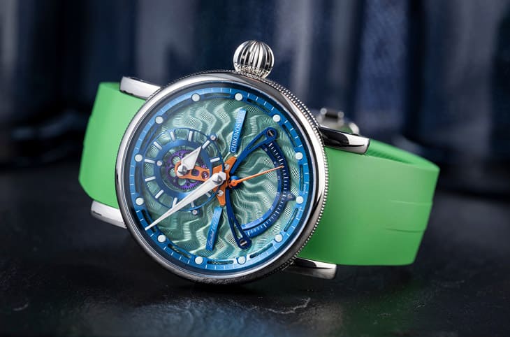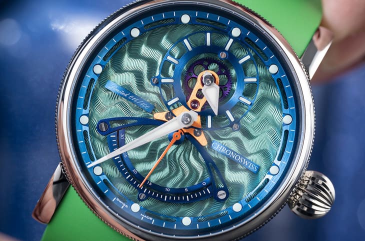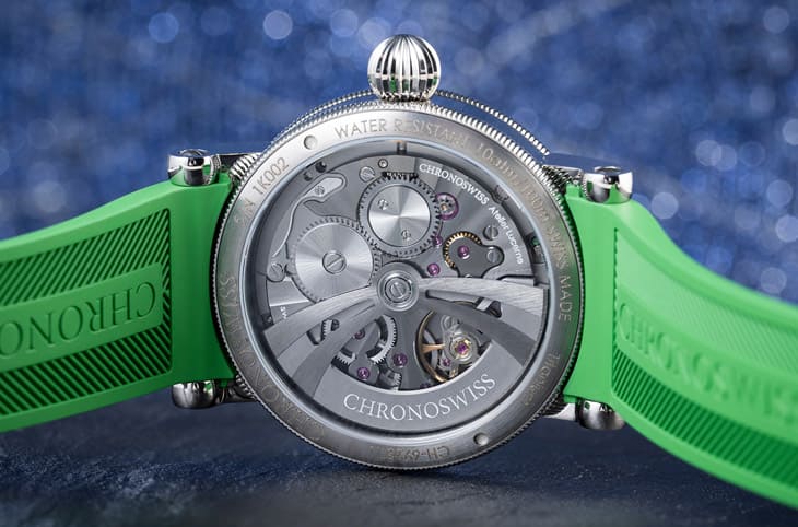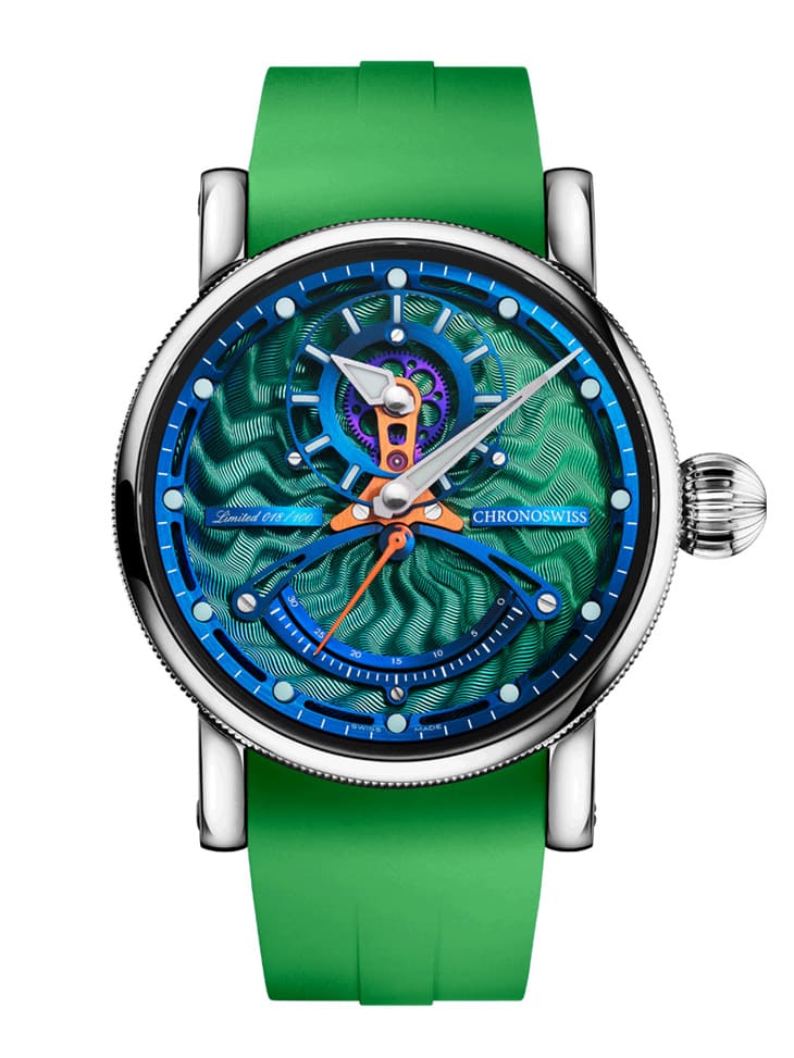 表款的面盘以机刻雕花刻出不规则状的放射纹,并且经过CVD涂层装点,配合花纹反射光线的作用,使得CVD涂层能呈现出一种绿色渐变至蓝色的彩虹质感,此外手表面盘上的刻度环、时标环、扇形逆跳刻度等零件纷纷镀上金属蓝色,至于联系时针与分针的桥板与秒针则是镀上橘色,小时轮系中还有呈现幻紫色彩效果的齿轮,这些明艳吸睛的色调突显出手表独树一帜的显时方式,CHRONOSWISS也顺应绿色怪兽主题替手表配上绿色橡胶表带,戴在手上远远看就很容易引起别人的注目礼。