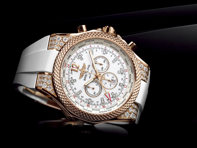 摩登英伦风尚与精湛瑞士工艺完美相融的巔峰之作,百年灵宾利世界时间计时手表(Breitling for Bentley GMT)汲取豪华尊驾与顶级时计精萃,在旅途中寻遍世界全新生活艺术。凭借多国时区显示系统,巧妙地把世界时区显示于腕间:独立时针配以红色空心叁角形尖端,以一圈二十四小时显示,独立调校可显示第二时区时间,并区分白天黑夜;刻有24个城市名字的旋转表圈,使全球时间一目了然。百年灵宾利世界时间计时手表午夜黑碳版(Bentley GMT Midnight Carbon)凝聚低调奢华的动感激情以及午夜般幽魅的深邃外形,将别具一格、炫酷硬朗的纯黑色设计贯彻于每一个至臻细节 ;精心雕琢的黑色环形鏤空表盘下,跳动着一颗根据最精密引擎科学设计的百年灵高性能自动上弦计时机芯,精准可靠无与伦比。在佩戴大型手表已然成为一种时尚的摩登当下,百年灵宾利世界时间计时手表红金镶钻版(Bentley GMT Red Gold Gemset)拥有魅力超凡的49毫米超大白色表盘,红金表壳镶嵌奢华璀璨的美钻,经至臻尚美的细节打造,更练就为糅合时间艺术和汽车美学的女性腕间臻品。集聚奢华与成就、性能与荣耀,牵手挚爱环球旅行,一起解读时间与速度的永恆奥秘。