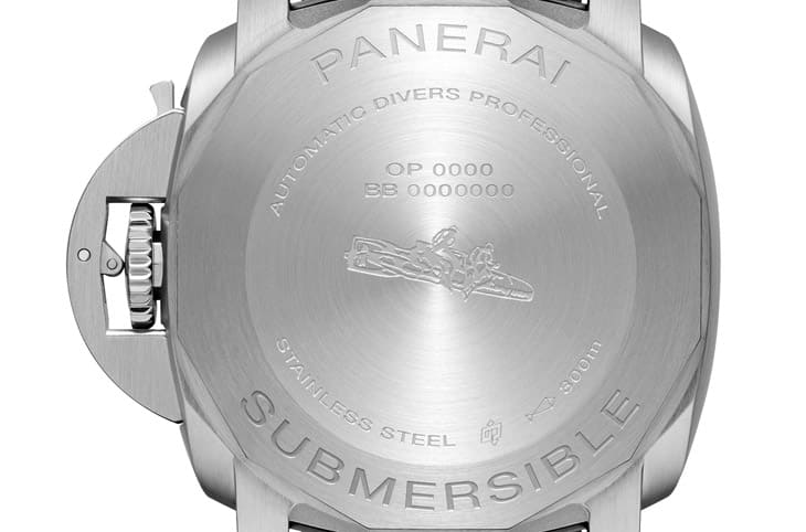 ▲表背同样是刻有慢速鱼雷图案的实底盖,此处也一併刻上手表的材质、防水性能以及系列名称等资讯。
