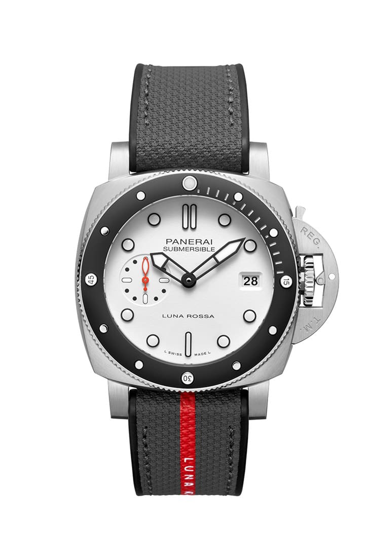 ▲手表的灰色表带下半部印有红色条纹,以及Luna Rossa帆船队名称,此为这个联名系列一大共同特徵。