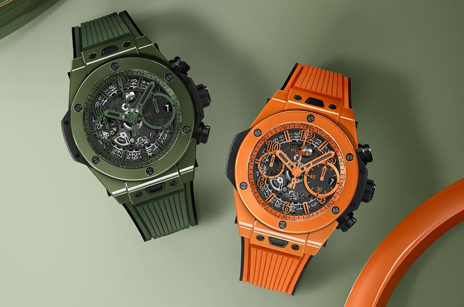 ▲宇舶2024年开发出首见的「傲然橘」陶瓷,另外绿色陶瓷家族也衍生出「墨绿」色调赋予Big Bang Unico计时码表崭新视觉张力。