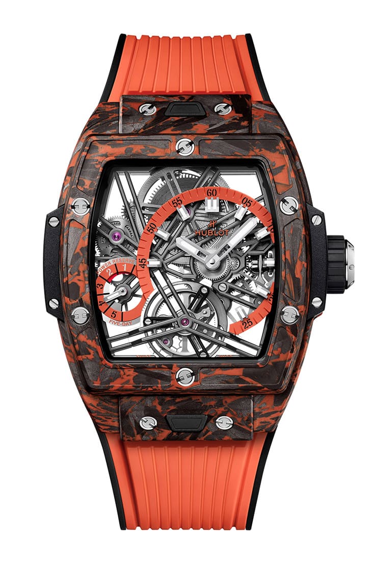 黑色碳纤维、橘色微玻璃纤维材质/HUB6020手动上链机芯/偏心时、偏心分显示/陀飞轮装置/动力储存显示/蓝宝石水晶镜面、透明底盖/防水30米/表径42mm/限量50只/参考价:NT$ 3,226,000