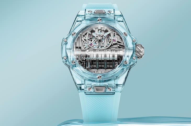 不让陶瓷材质专美于前,宇舶近年在研发蓝宝石透明表壳的成果同样有目共睹,品牌在日内瓦钟表与奇迹表展再度超越自己,包括Big Bang MP-11手表、Big Bang Unico计时码表以及Spirit of Big Bang Sang Bleu计时码表,都纷纷启用这种坚硬又具有全方位视角的高科技材质。首先在功能最复杂的Big Bang MP-11手表部分,宇舶又再新创出湖水蓝宝石一展新气象,一如既往这种「特殊色」蓝宝石保有高硬度与高耐磨抗刮性,而且材质本身的稳定性也很高,加上它的湖水蓝色透明度系数经过品牌精密计算且测试无虞,让人得以藉由「有色眼光」欣赏手表搭载的HUB9011手上链机芯,这枚机芯採用立体结构,尤其发条盒多达7枚串连在一起形成滚筒状,能合力输出长达14天的动能,使得经镂空处理甚具赏玩逸趣的手表,其实用性也被推向极致。