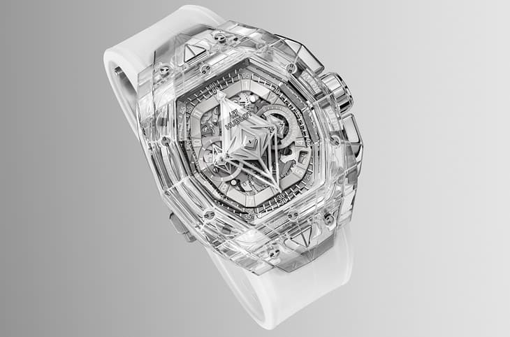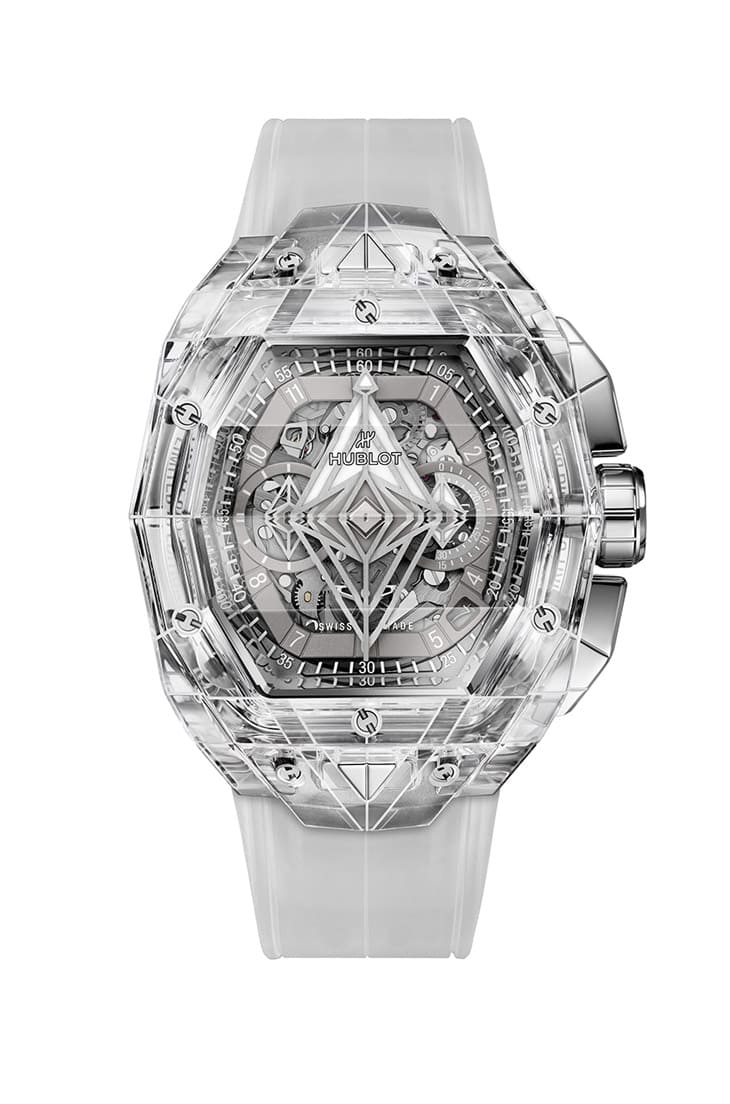 蓝宝石材质/HUB4700自动上链机芯/时、分、小秒、日期显示/计时码表功能/蓝宝石水晶镜面/防水30米/表径42mm/限量100只/参考价:NT$ 4,414,000