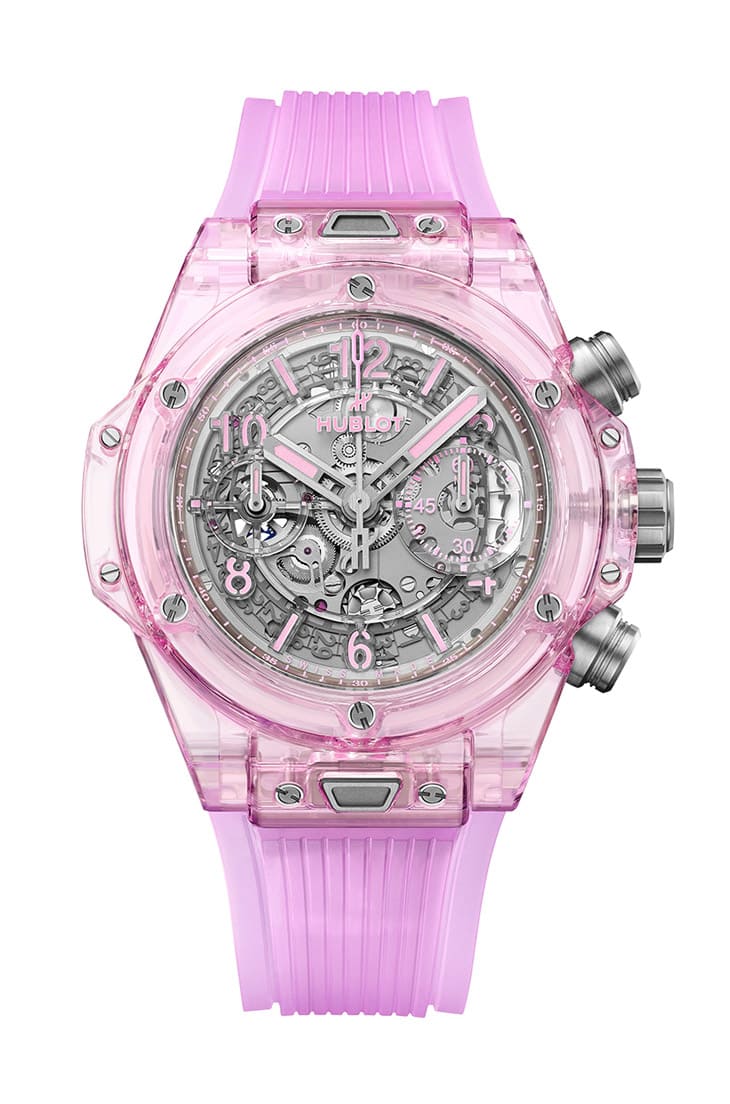 粉红蓝宝石材质/HUB1280自动上链机芯/时、分、小秒、日期显示/计时码表功能/蓝宝石水晶镜面、透明底盖/防水30米/表径42mm/限量100只/参考价:NT$ 3,735,000