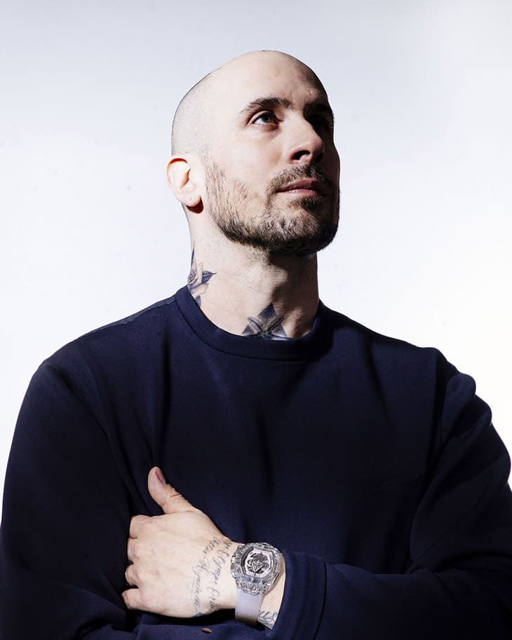 ▲Sang Bleu刺青工作室主理人Maxime Plescia-Buchi亲自佩戴以蓝宝石材质制作的Spirit of Big Bang计时码表,尽展高阶潮流手表品味。