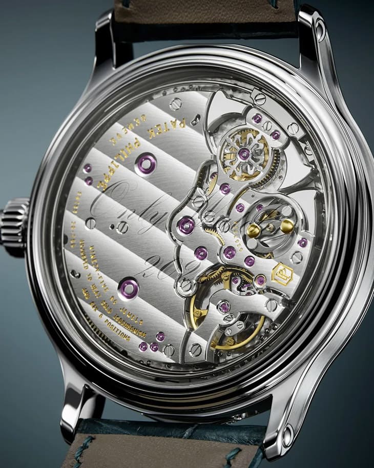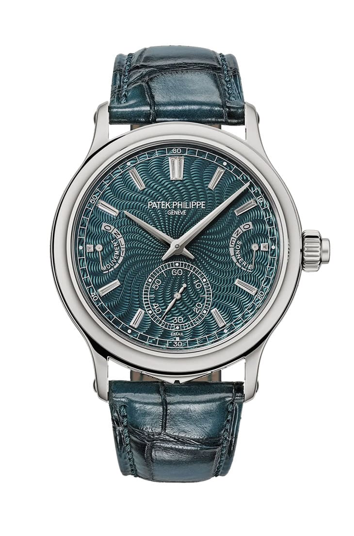 专为Only Watch慈善拍卖会而生的独一无二款式6301A-010改用了不锈钢制作表壳,配上蓝绿色鱷鱼皮表带,面盘格局与铂金款相同,例如6点方向有小秒盘、3点方向和9点方向则是报时与走时功能的动力储存显示。不过6301A-010毕竟是一款特制版本,因此百达翡丽也修改了不少细节,像是面盘先以机刻工艺刻上漩涡纹,并且覆上大明火蓝色透明珐琅(和5178G-012有点似曾相似的味道),此外时标镶上12颗钻石取代原本的金质立体阿拉伯数字,同时时、分指针也变更为刻面太子妃式指针,种种细节修改都让6301A-010散发出更为独特且珍贵的收藏意义。