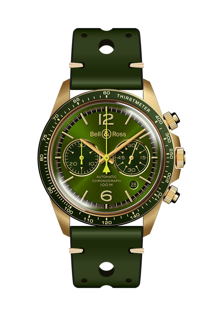 青铜材质/R-CAL.301自动上链机芯/时、分、小秒、日期显示/计时码表功能/蓝宝石水晶镜面、透明底盖/防水100米/表径41mm/限量50只,BELL & ROSS官网独卖/参考价:NT$ 183,000