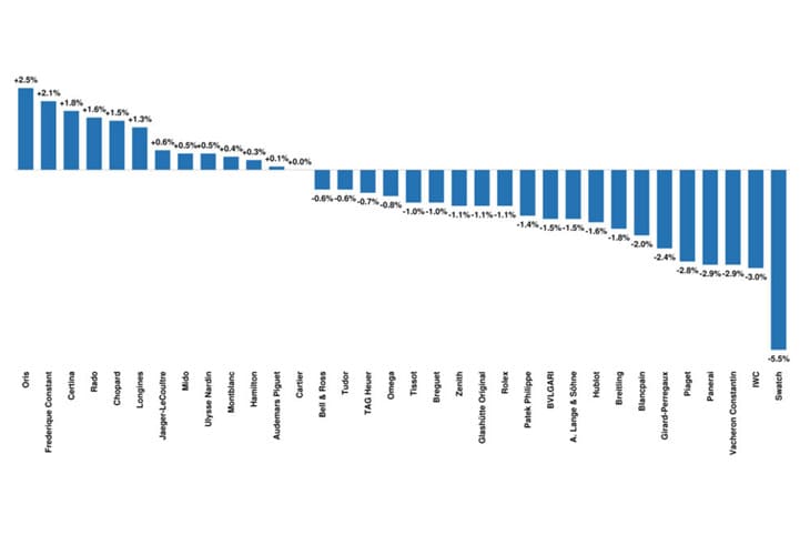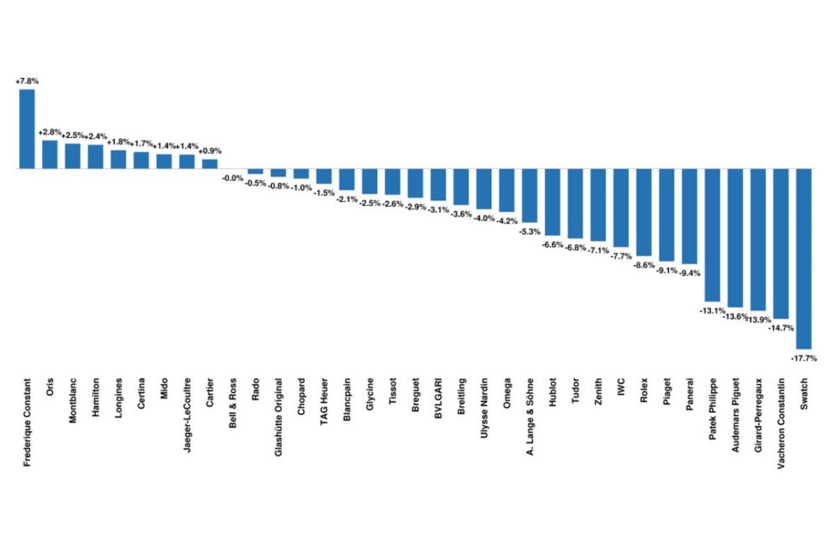 ▲2024年第一季SWATCH手表二级市场行情与2023年最后一季相较也下跌5.5%之多。Source:Morgan Stanley Research, WatchCharts