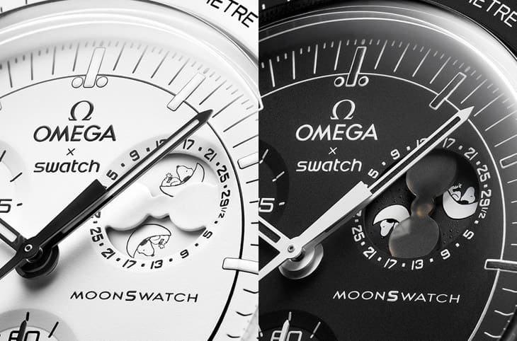 不过SWATCH在2024年又接连释出两只白色、黑色的Bioceramic MoonSwatch Mission To The Moonphase再度引爆市场热议与抢买风潮,因为手表进一步结合了超霸史努比登月表的元素,并且功能也在计时码表之外增添月相显示,这样的创意比起2023年的Mission to Moonshine™ Gold更吸引人,因此这款表目前的二级市场价格多数都还是超定价水准。