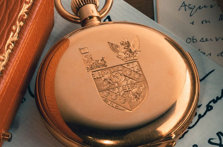 带有猎表设计的这只怀表在正面的表盖上刻有邱吉尔的爵士徽章图案,内侧则刻有"To Winston with gratitude H. H. Asquith Xmas 1905."字样,清楚交代了手表的来龙去脉。怀表本身的特色除了以18金制作以外,还包括无钥匙上链机芯、三问报时功能、白色珐琅面盘、金色中央铲形时针和鞭形分针,搭配6点钟位置小秒盘的蓝钢秒针等。当初H. H. Asquith是从被誉为「皇家天文台时计制造商」的知名制表师John Bennett爵士那购入这款表,因此猎表的表盖掀开后,在背面的底盖上可以看到刻有这位制表师工作坊的标志。