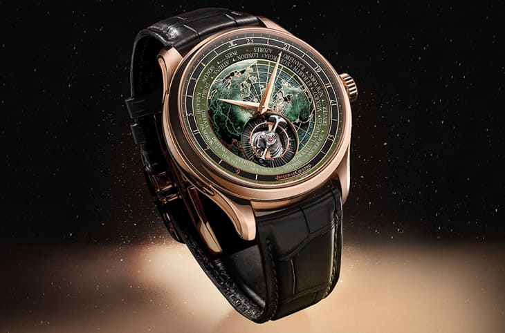 超卓传统大师948机芯手表改成玫瑰金材质后,鱷鱼皮表带也换成了黑色,至于面盘虽然格局、功能都与2022年问世的那款前作一致,可是积家重新调整了面盘配色,相较于前作以写实地貌色彩搭配蓝色象徵大海如实还原地球俯瞰视角,新作则是主打「绿色」,同时面盘俯瞰的世界地图也有了不同角度,从细节中区隔两款作品的个性。
