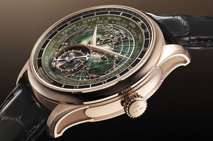 18K玫瑰金材质/948自动上链机芯/时、分显示/公转陀飞轮装置/世界时区显示/绿色半透明漆面波浪形扭索饰纹、内填珐琅面盘/蓝宝石水晶镜面、透明底盖/防水50米/表径43mm/限量20只/参考价:NT$ 9,050,000
