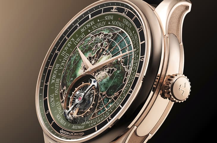 手表背面呈现出的948自动机芯为积家首款结合世界时区与公转飞行陀飞轮的杰作,品牌获得的专利技术确保零件数多达388枚的机芯其陀飞轮得以24小时公转一圈,连同地图经纬线和城市环同步运转,目的是呼应平太阳日的周期。积家为了方便佩戴者,将手表的功能设定藉由单一表冠就能同步设定,每当佩戴者到达新的国度,设定好所在城市之后,接着操作表冠可以用一小时为单位前后调校时针,至于分针还是会持续运作,不受时针转动而影响,这点会让人在享受手表的复杂功能之际,更爱上它相当贴心便利的操作设定。