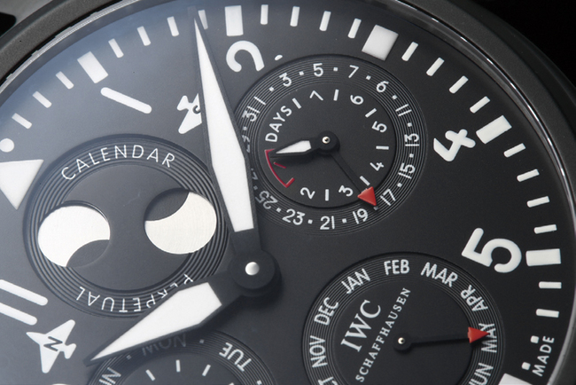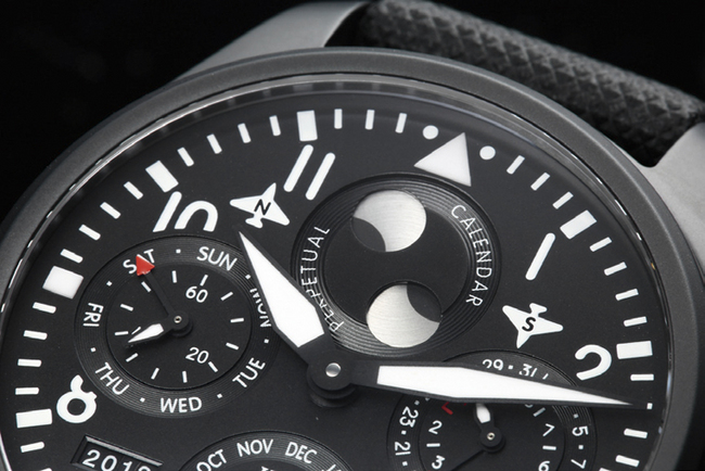 策略面的东西不提,这款大飞行员万年历表款本身的卖相还真是好,它结合了Top Gun、南北月相万年历等等品牌最受欢迎的产品,对有实力又死忠的表迷来说差不多是直接加进Must Buy了。南北月相万年历已经是IWC的老经典了,不过同样的面盘配置到了飞行员系列却又生出不少讨喜的元素。首先是南北月相,月相显示本身算是中规中矩,不过两边用来标示南北的小飞机就非常特别了,原本他们南北的标示都是用两个半圆,这次特别加入了跟系列相呼应的元素,既是个好设计、也是个讨好的设计。