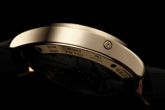 烟囱式表圈的好处是可以让表壳侧面的厚度看起来比实际上的来得薄,不过这点在另一款超薄月相款上头比较明显,这款表壳本身的厚度有12.8mm,比较看不出效果。