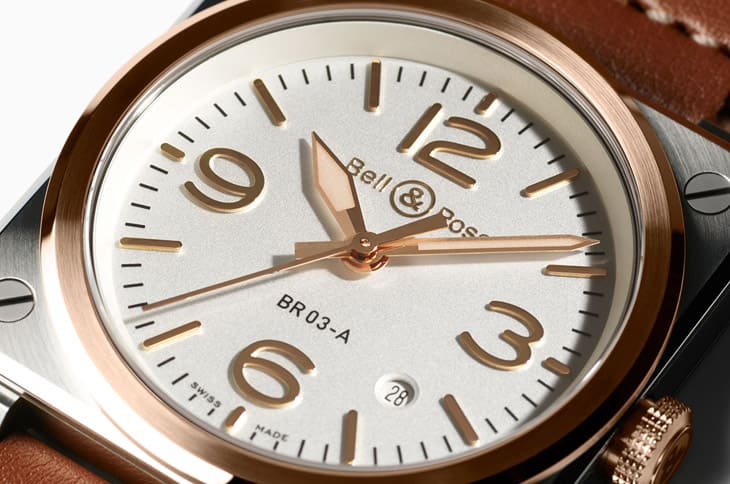 BELL & ROSS替手表搭配乳白色面盘,品牌在制作过程中会透过电解程序在拋光面盘涂上一层雾银,造成媲美蛋白石的乳白色效果,再以浮石及酒石进行后续的打磨处理,这使得手表的面盘细看会发现很多繁复的纹理,替乳白色营造一种轻微的幻彩作用,与一般纯白面盘的朴素相对之下质感更上层楼。