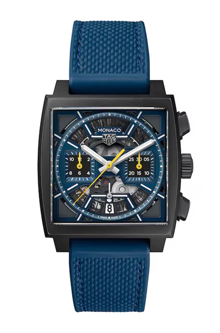 泰格豪雅这次把2023年Monaco系列初试啼声的镂空设计带往新的方向,主要就是透过电镀以及改用不同的零件配色,赋予手表新意。虽然进行了镂空处理,可是Monaco系列一些数十年如一日的特徵并没有被影响,例如圆形分钟刻度、方形小表盘以及棒状时标等,此外立体的剑型指针也没有因为镂空而改变造型。泰格豪雅于设计上让人感到惊艳之处在于就算手表面盘改成镂空设计,可是判读时间的直觉度和清晰效果并没有因此而打折扣,原因和镂空后所呈现的机芯结构多数为黑色、银色系有关,而在面盘细节的配色部分,品牌是在黑、银色背景上採用海军蓝色作为刻度环、小表盘边框的主要色彩,同时大、小计时指针使用的黄色是个点睛之笔,搭配起来手表散发出一种海洋般的活力,对于地处地中海海岸线的摩纳哥亲王国而言,这样的配色还真的是非常贴切。