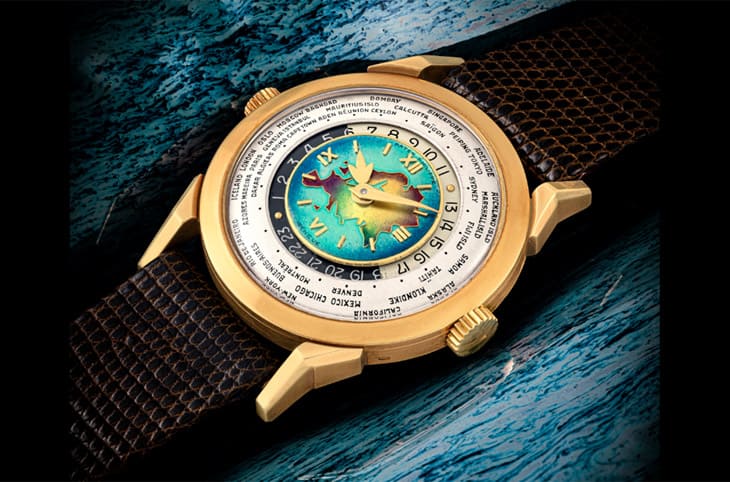 最后大家最关心的就是Important Watches拍卖会身价最高的作品到底是何方神圣。答案揭晓是Lot 2256,一款百达翡丽于1953年制作的2523J双表冠世界时区手表。它以黄金制成,面盘以掐丝珐琅工艺绘制欧亚大陆地图,绘制者是鼎鼎大名的珐琅工艺大师Marguerite Koch,由于手表是该型号目前已知仅存3只以掐丝珐琅绘制欧亚大陆面盘的作品,另外两只分别被收藏在日内瓦的百达翡丽博物馆以及另一位私人收藏家手中,因此它的稀有程度不言而喻,最终手表拍出65,475,000港币(约合台币2亿7143万)鉅额,成为这场拍卖会中最耀眼的一颗明星。