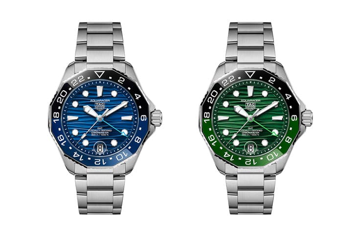 再来看到两地时间款的全新Aquaracer Professional 300米潜水表,泰格豪雅首波也是先出不锈钢款式,分别有蓝面和绿面两款,其中蓝面再分成链带与蓝色胶带两种版本,绿面则只有链带可选。相较于日期款的单色单向旋转陶瓷表圈,两地时间款表圈可以双向旋转、刻度改成24小时,它也採用了双色陶瓷以突显两地时间的日夜之分。蓝面款的表圈为蓝、黑双色、绿面款表圈则是绿、黑双色,而在面盘上,GMT指针也分别配合面盘顏色採用浅蓝或浅绿色,品牌这次将秒针与时、分针维持一致的银白色调,因为上一代将秒针针尖涂上和整枚GMT指针相同顏色的设计,有可能会造成视读时的误认,如今微调过秒针和GMT指针的配色后,手表不同目的的显时功能就能更为一目瞭然。