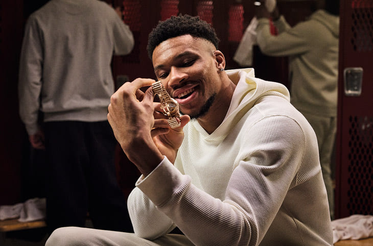 这款独特的球星专属收藏採用玫瑰金制成,绿色面盘上有着对比鲜明的白色计时盘,其上搭配金色阿拉伯文数字时标、白色刻度环等,透过这些精心安排的色彩向他以及他效力的球队致敬,同时也为了纪念他从希腊无国籍青年一跃成为 NBA篮球偶像的励志故事,他的成长历程曾在2022年成为电影《崛起(Rise)》的灵感,另外2024年也会有相同主题的纪录片《传奇之旅(The Marvelous Journey)》登场。