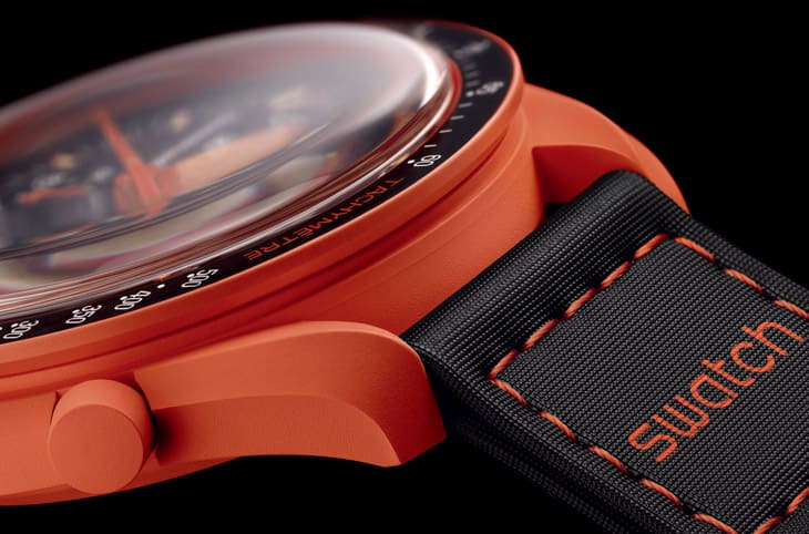 Mission on Earth-Lava的表壳为红橙色,直接呼应熔岩鲜艳却又充满危险的形象,至于手表的生物陶瓷表圈、VELCRO®表带和面盘则都是黑色,用以突显出表壳、计时按把与表冠红橙色的抢眼感。虽说表款的设计主题与过往不同,但是手表整体造型、尺寸大致都和先前的MoonSwatch大同小异,不过以Mission on Earth-Lava为例,它事实上还悄悄挹注了Speedmaster Moonwatch "Ultraman"表款的梗,从手表指针的橙色以及中央计时大秒针的造型等处可略窥一二。