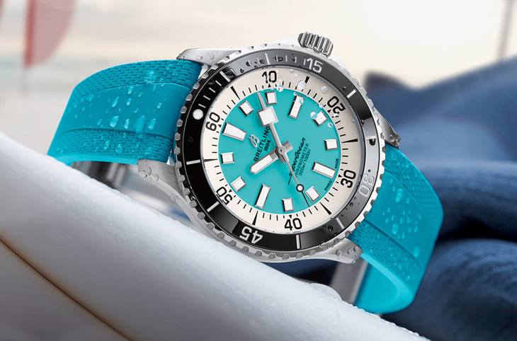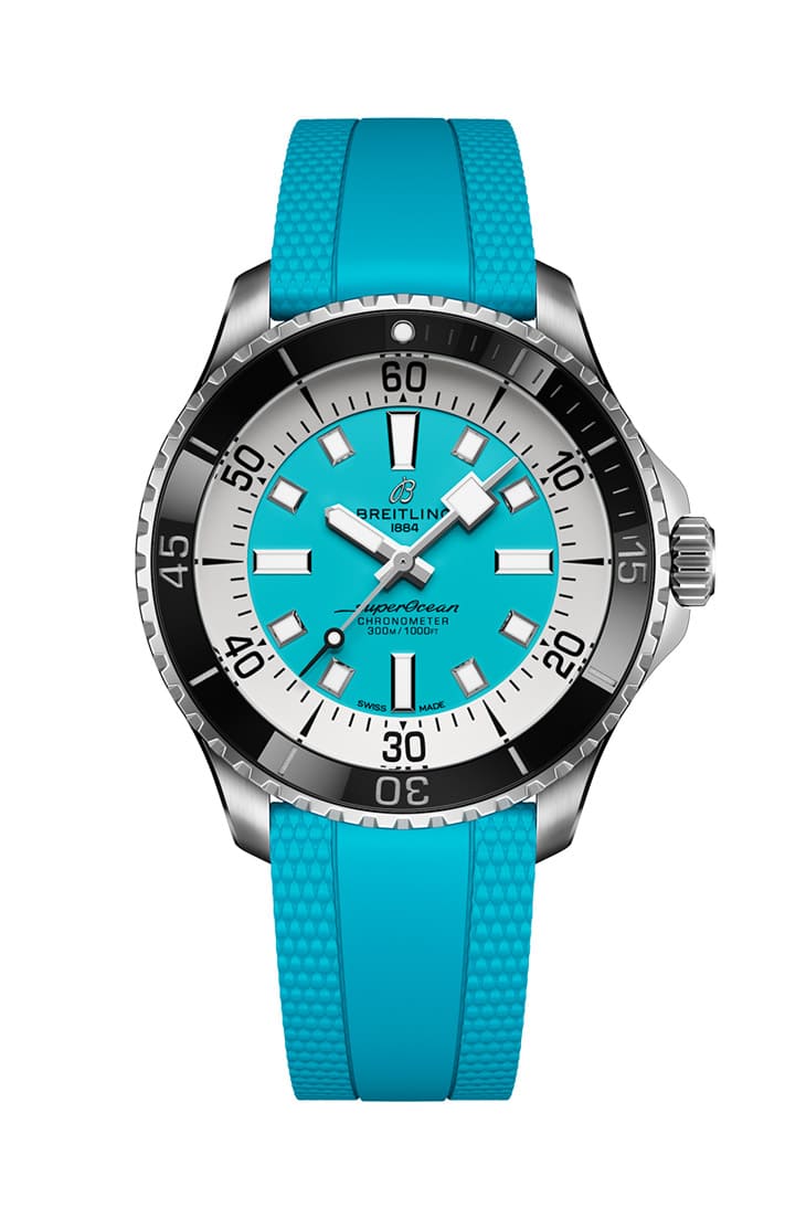 ▲土耳其蓝面盘的Superocean Automatic 44今年新增与面盘同色的橡胶表带新款。