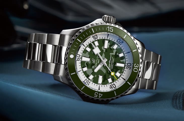 最后不可不提的当然就是Superocean Automatic 46 Super Diver,它同样是奠基于SuperOcean Slow Motion,只是手表随着防水性能大幅强化,也衍生出更多现代专属设计,包括双向旋转表圈和专利安全锁,其比传统的单向旋转表圈更能防止表圈误触的机会,让佩戴者可以更放心注意时计上显示的下潜时间。百年灵这次分别推了绿色或黑色陶瓷表圈款式,两者都配上钛金属表壳,而面盘则是与表圈同色系的迷彩图案,在平日佩戴更能展现表主本身的品味与突显手表的运动风格。