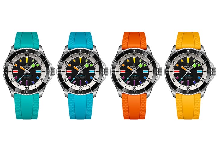 ▲36或42mm的Superocean Automatic分别在白色或黑色面盘涂覆彩色夜光涂层。