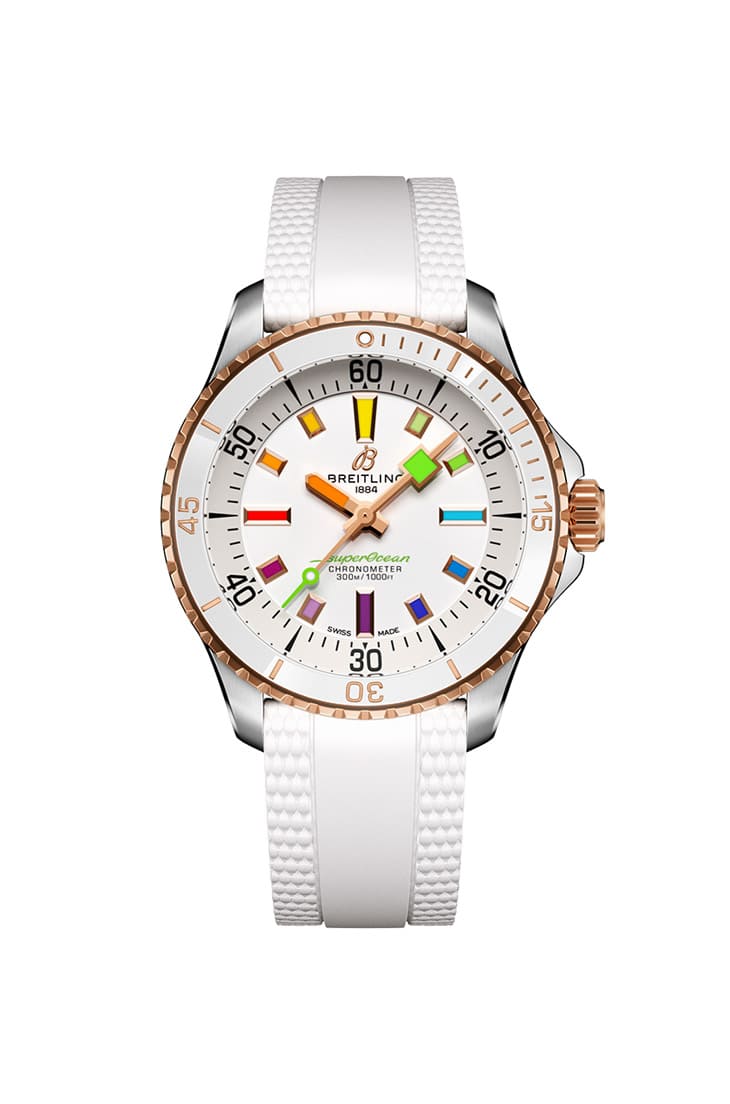 另外两款表径分别为42mm和36mm的Superocean Automatic就更有意思了,品牌于变更表径之餘,虽然从表圈到面盘都还是黑白配色这个组合,可是点缀在时标与指针上的Super LumiNova®夜光涂层别出心裁地各别呈现出黄、绿、蓝、靛、紫、红和橘等的繽纷彩虹色调,在环境明亮的情况下,这些彩虹时标与指针看起来充满活力,而在光线不足的时候,彩虹夜光涂层也能发挥它们的夜光功效,让佩戴者随时随地清楚掌握当前时刻。这一批Superocean Automatic中,42mm款式皆以不锈钢制成,市场能进一步选择土耳其蓝、海蓝色、橘色和黄色橡胶表带等不同版本,至于36mm款式的表壳和表圈为不锈钢加上玫瑰金组合,搭配白色橡胶表带,同时面盘和陶瓷表圈也都改成白色,对于女性而言吸引力更上层楼。