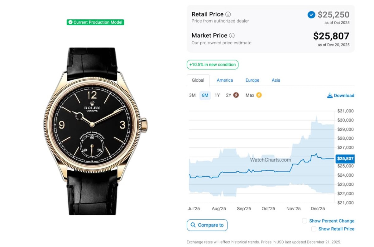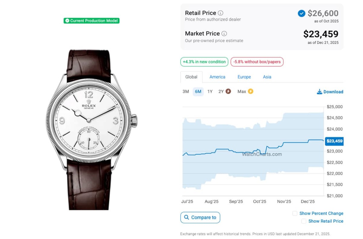 根据高级手表市场调查研究机构WatchCharts的资料,1908系列的发展似乎慢慢走上Cellini系列的旧路,因为在2025年6月时,当时黄金材质的52508二级市场价格约为24,057美金(约合台币76万)、白金材质的52509行情则是22,820美金(约合台币72万),至于铂金材质行情还很惊人有55,858美金(约合台币176万3)这麼高,先出的两款当时都已跌破定价,主要因为那时候1908系列已经不算新,至于晚一年出道的铂金冰蓝面还在享受蜜月期的红利,溢价率是此系列的标竿;又过了半年后的现在,若对照劳力士其他热门表的情况而言,1908系列的行情应该也是持续往下走才是。