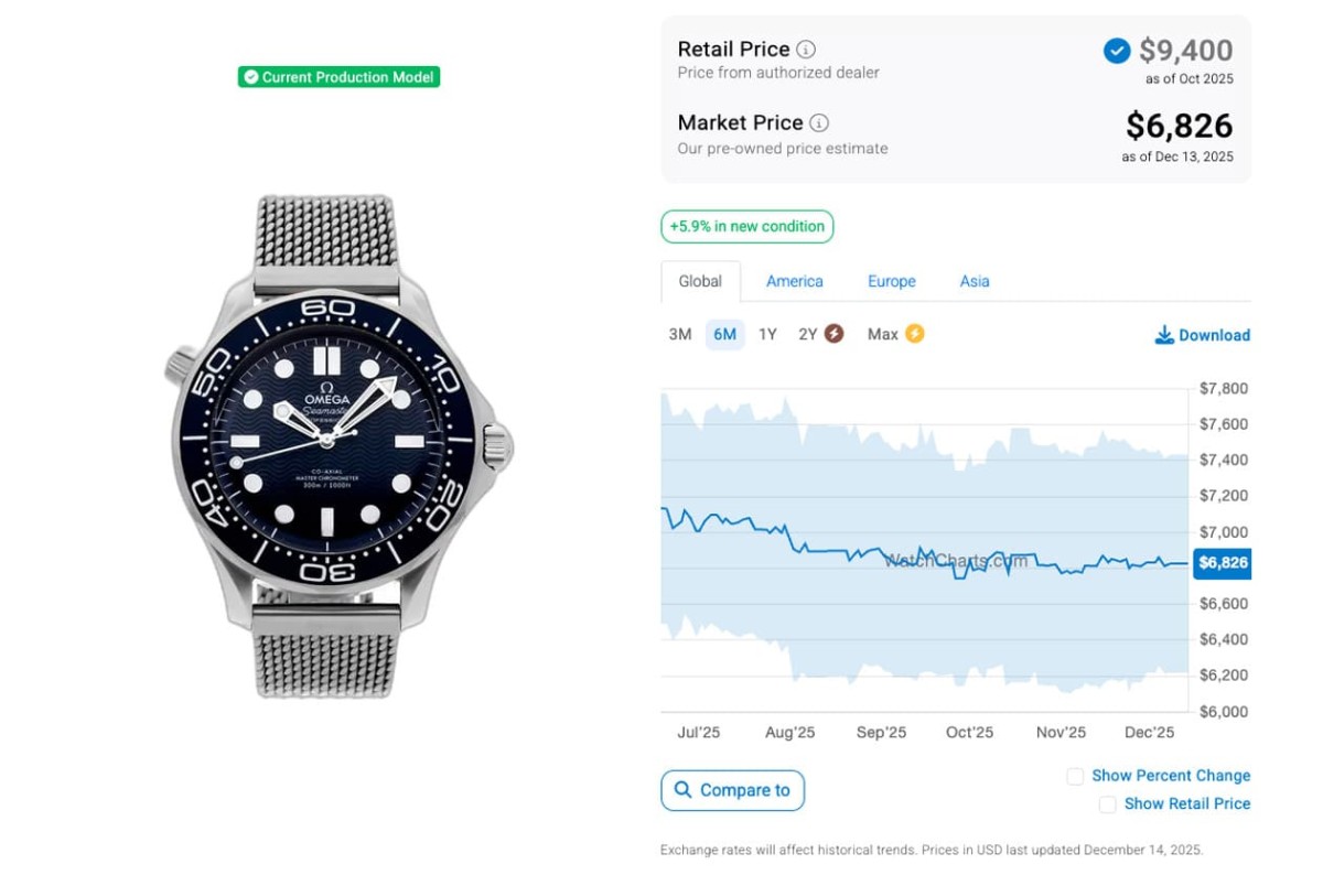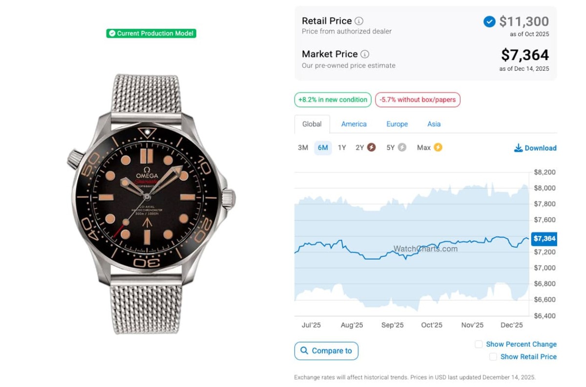 而在经过半年之后的现在,同样从WatchCharts观察的数据可知,两款表经过这段时间以来的发展,行情又出现了一点变化,210.90.42.20.01.001(007限定款)这期间价格有涨有跌,国外报价在7,100~7,300美金之间来回震盪,进入到2025年前2个月为止行情开始直直落,可是2月中旬后身价又弹起来,到了4月才又往下落,7和8月各短暂冲到今年新高,9月价格一度走下坡到10月后则又出现上扬局势,迄今维持在半年来的相对高点,二级市场价格为7,364美金(约合台币23万)。而210.30.42.20.03.002(庞德电影60周年纪念款)则有点每况愈下,它的超定价行情持续到2024年5月中以后正式告终,在那之后连续一年多国外报价都是呈往下跌的走势,2025年6月整月虽开低走高,到7月以后到现在又连续震盪,如今进一步跌到剩下6,826美金(约合台币21万3),已经比007限定款更低价了,行情为出道后的新低,加上欧米茄在2024年底又接连推出同样配置米兰链带的海马潜水300米,使得庞德电影60周年纪念款过往的那种特别感被稀释,二级市场行情与007限定款逐渐拉近。