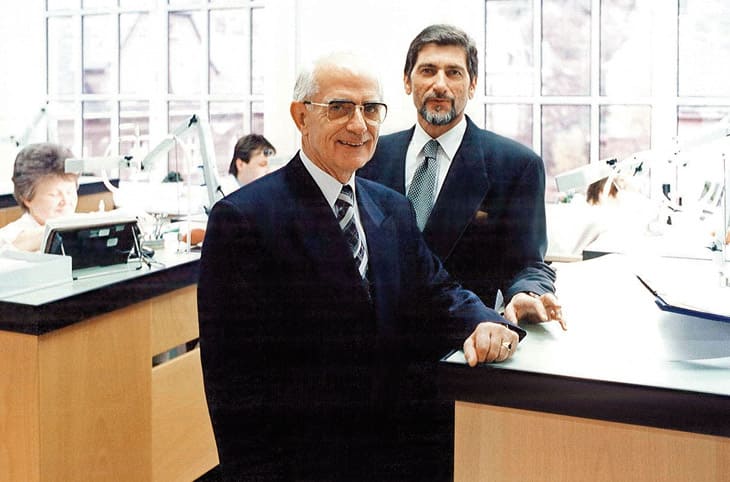 ▲1994年时,Walter Lange(左)与重要伙伴Günter Blümlein于朗格制表部门合影︒