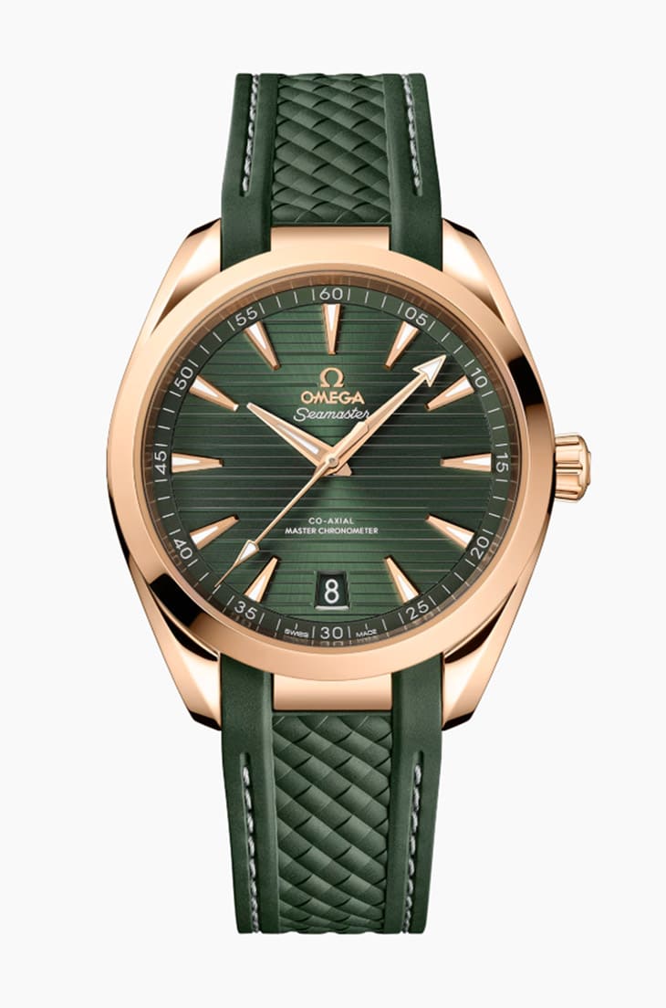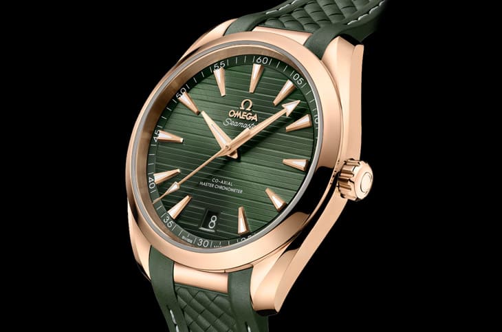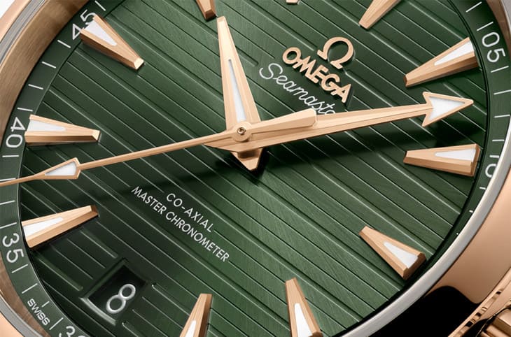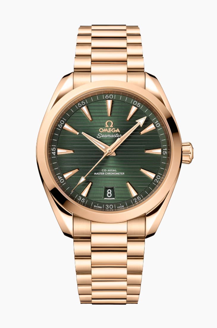 ▲新款41mm Aqua Terra 150米大三针皆与Moonshine™金材质相关,其中全新款式搭配绿色甲板纹面盘,一展雅致贵气。