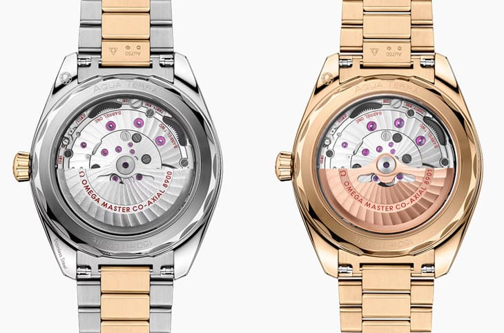三款融入Moonshine™金的41mm Aqua Terra 150米大三针表背一律都是透明底盖,推动手表运作的核心是8900或8901机芯,这两枚机芯规格基本上是一样的,只不过后者的自动盘和摆轮桥板改用Sedna™金材质散发高级感,不用多说这是专门供全金款式的细节微调,机芯具有双发条盒以输出60小时动能,同时其时针能以一小时为单位快调,虽然在调校日期时需要把时针快调转完两圈才能完成,但是这种设计能够往前往后调日期,也比较没有调时禁区的顾虑,使用起来还是有一定的便利性。