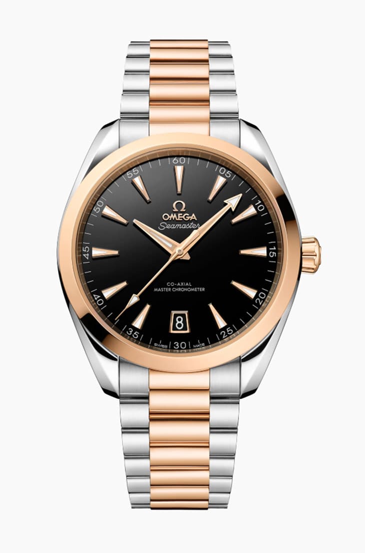 至于半金款式的面盘则是向先前那三款不同尺寸的海马Aqua Terra 150米看起,欧米茄替手表换上黑色漆面面盘,如此一来,整只表的顏色层次更为丰富,黑面有助于烘托金质时标、指针的存在感,欧米茄还别具巧思地在6点方向的日期窗边缘加设金色边框,使得手表更显精致。